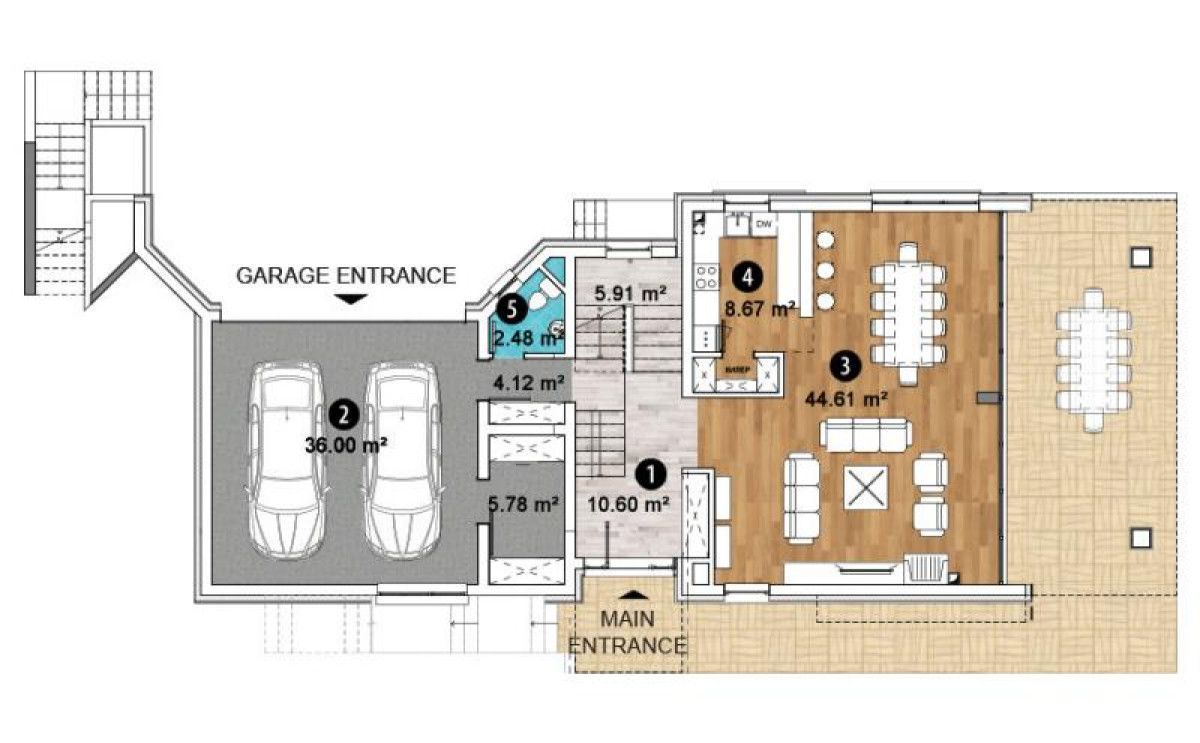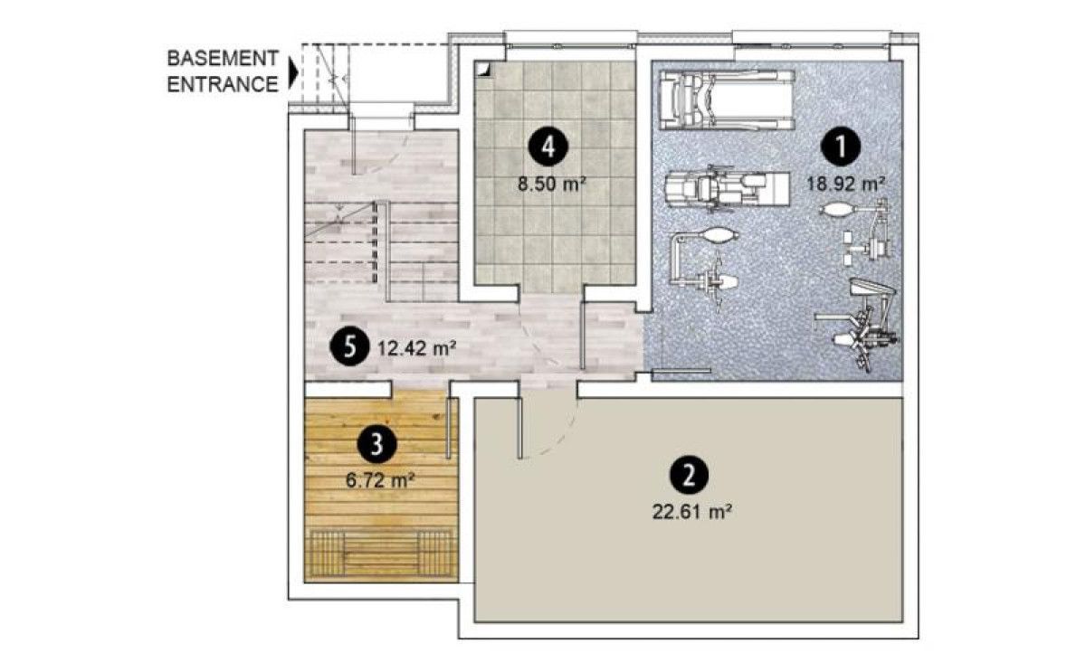 Level 0 with an area of 85.13 m2 1. Fitness 2. Room for a home cinema or entertainment room 3. Sauna 4. Technical room 5. Exit to the yard