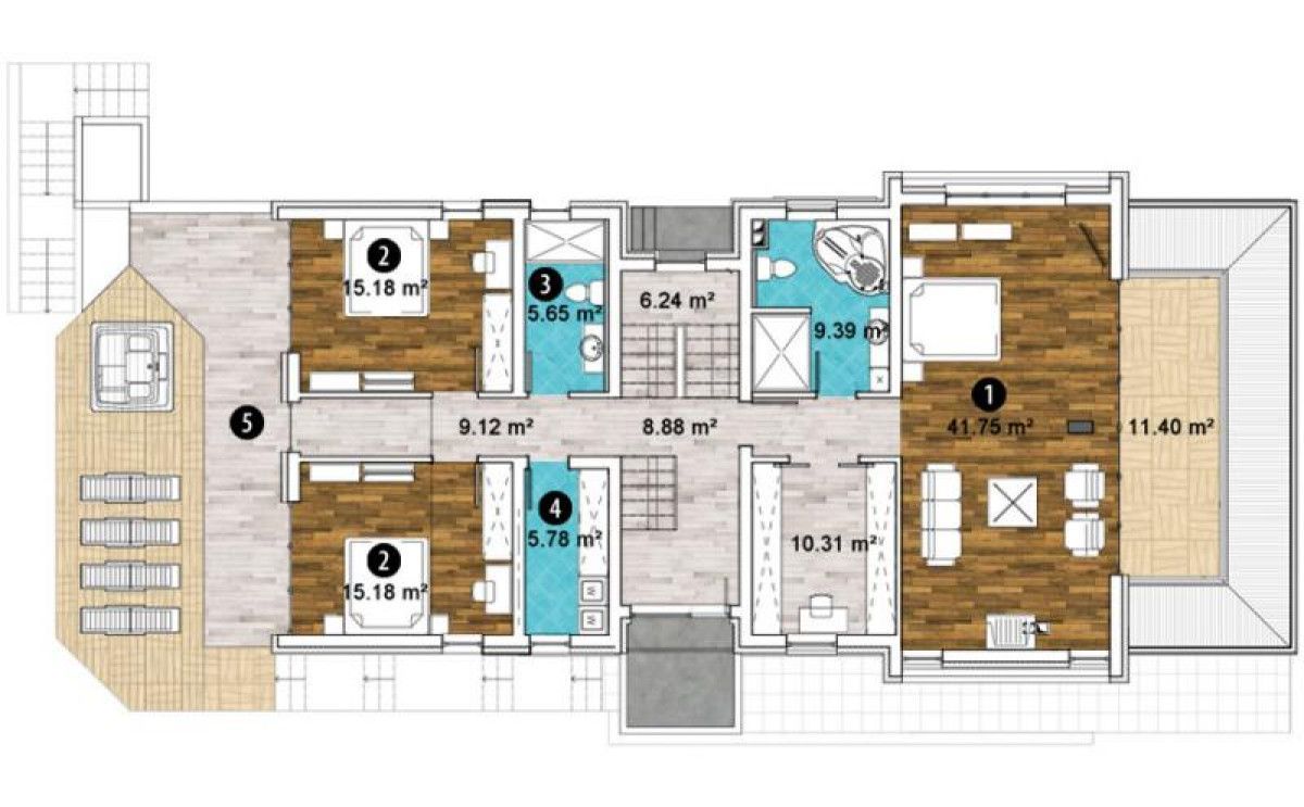 Level 2 with an area of 171.55 m2 1. Master bedroom with living room and fireplace, closet and bathroom. Exit to a southern terrace and a view of the Vitosha and Lyulin mountains 2. Two spacious bedrooms with wardrobe compartments and access to the veranda 3. Bathroom for both bedrooms 4. Wet room 5. Exit to a veranda with the possibility of a jacuzzi and a place to relax.
