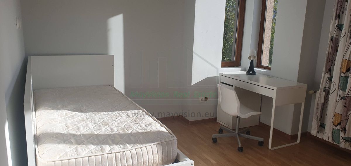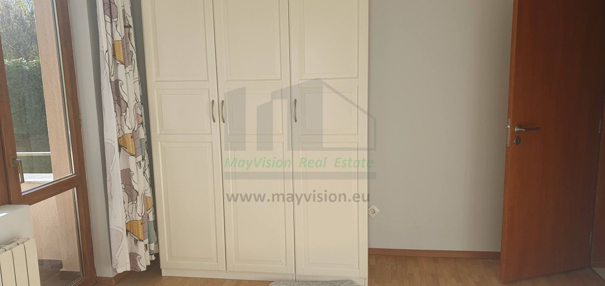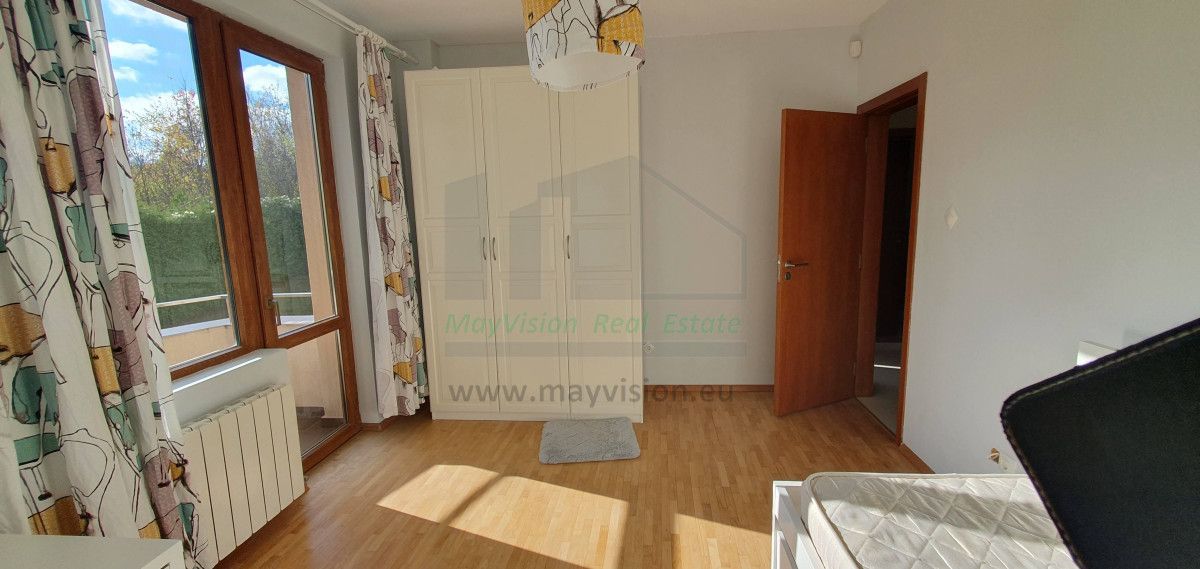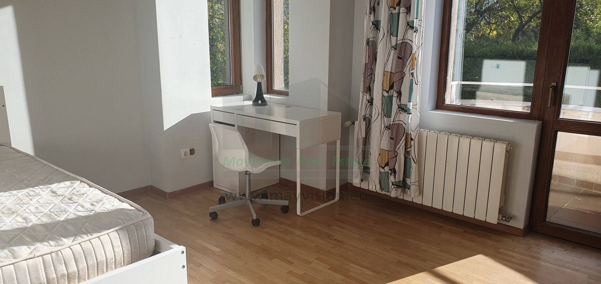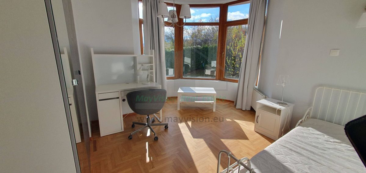 We at MayVision Real Estate offer you a spacious house in a clean and peaceful area, right next to the "BEL VALLEY" COMPLEX - the "Bells" park. Business Park Sofia, HP, HUNDAY, COCA COLA, Post Bank BMW, TECHNOPOLIS, COMO and other stores are a few minutes away. The property is divided into two parts - a main house and a completely independent apartment with an extremely practical distribution and the possibility of independent use by two households. The garage is for two cars with internal and external access to both parts of the house, there are two separate external parking spaces. The ground floor has spacious rooms suitable for a sauna, hobby area and others. DISTRIBUTION: HOUSE PARAMETERS: First floor - living room with dining room, toilet, terrace with barbecue and open space to a landscaped yard. Second floor - three bedrooms, two bathrooms, two terraces. Third floor - two rooms with separate storage space and laundry room, panoramic terrace. APARTMENT PARAMETERS: Bright living space and terrace to the yard, bedroom with closet, spacious bathroom with bathtub, equipped gym. SPECIFICATIONS: The heating is gas, with two separate boilers that supply the apartment and the house independently, there are air conditioners installed. The yard is maintained by a landscaping company, and the fee is included in the rent.
