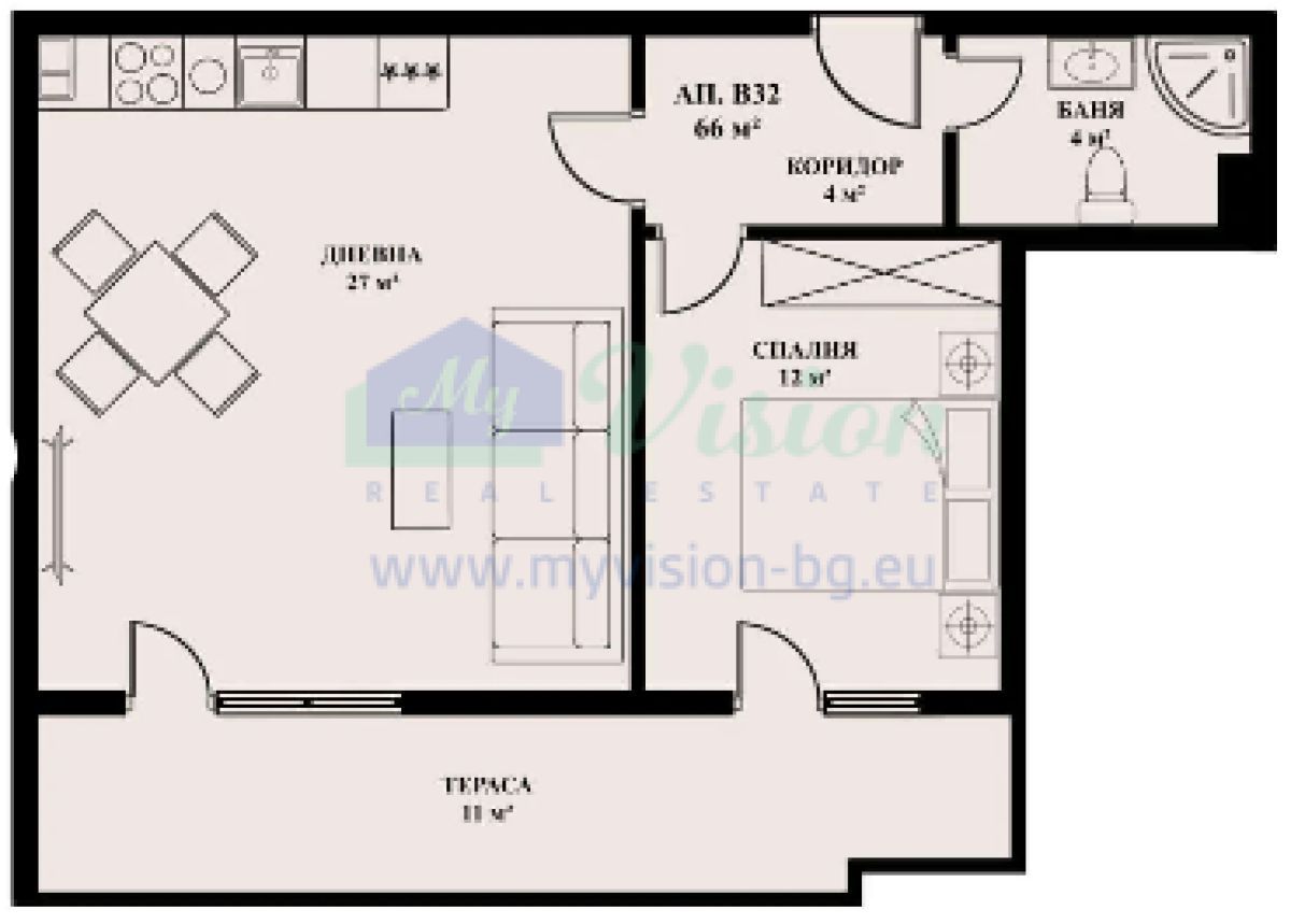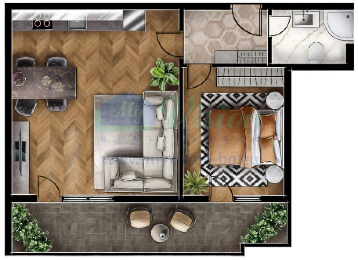 We at MyVision Real Estate are proud to offer you an one-bedroom apartment for sale in a new residential complex, located in a convenient area near a public swimming pool, public transport stops, "Billa" and "Lidl" supermarkets, car services, public transport stations, gas stations, a variety of shops, market, schools and kindergartens, green areas, hospital, gym and restaurants.