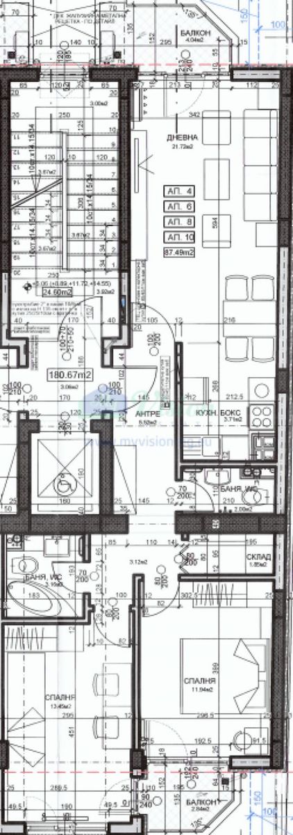 It is located in an area with good infrastructure and well-established public transport. It consists of a kitchenette with a living room of 26 sq m, two bedrooms of 13.45 and 12.00 sq m, two bathrooms with a toilet of 3.20 and 2.10 sq m. and balconies of 4.00 and 3.00 sq m. Storage of 2sq.m. The external walls are made of bricks with a thickness of 25 cm. and together with the reinforced concrete structure are thermally insulated from the outside with 10 cm. EPS. The internal partition walls are brick or aerated concrete with a thickness of 12 cm.